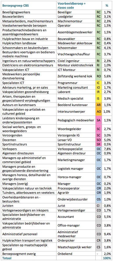 Het CBS maakt gebruik van zogenaamde beroepsgroepen/beroepssegmenten. Elke beroepsgroep bestaat uit verschillende beroepen. Deze beroepen zijn niet evenredig verdeeld over een beroepsgroep en kunnen bovendien verschillen qua persoonlijkheidskenmerken. Jobpersonality heeft per beroepsgroep een voorbeeldberoep gekozen die het beste past bij de omschrijving van de beroepsgroep. Op basis van dit voorbeeldberoep is bepaald welke twee persoonlijkheidskenmerken van toepassing zijn op de beroepsgroep. Een voorbeeld. De beroepsgroep ‘Leidsters kinderopvang en onderwijsassistenten’ bestaat uit twee verschillende beroepen. Een onderwijsassistent scoort het hoogst op sociaal en conventioneel terwijl een leidster in de kinderopvang (pedagogisch medewerker) het hoogst scoort op sociaal en artistiek. Bij deze beroepsgroep is ervoor gekozen om het beroep van pedagogisch medewerker als voorbeeldberoep te nemen en de persoonlijkheidskenmerken sociaal en artistiek aan deze beroepsgroep toe te kennen. De reden hiervoor is dat er veel meer pedagogisch medewerkers zijn dan onderwijsassistenten. Nadat op deze wijze alle beroepsgroepen zijn voorzien van persoonlijkheidskenmerken is er een indeling gemaakt van de beroepsbevolking op basis van persoonlijkheidskenmerken. In de tabel kun je dit ook zien. Alle realistische beroepen zijn lichtgroen gearceerd, de intellectuele beroepen zijn geel gemarkeerd, de artistieke beroepsgroepen (slechts twee stuks) zijn oranje gearceerd, de sociale beroepen zijn voorzien van de kleur roze, de ondernemende beroepen zijn lichtblauw en de conventionele beroepen zijn voorzien van een grijze kleur. Doordat er door het CBS bij de indeling van de beroepsbevolking met beroepsgroepen wordt gewerkt, gaat er bij het toekennen van een persoonlijkheidskenmerk op basis van een voorbeeldberoep wel informatie verloren en is de huidige methode daarom vrij grofmazig. Desondanks geeft deze een vrij duidelijk beeld. Vooral het lage aanbod van artistieke beroepen is opvallend te noemen, afgezet tegen het percentage mensen dat na het doen van een beroepskeuzetest hoog scoort op dit kenmerk.
