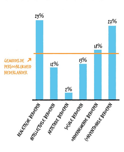 De samenstelling van de werkzame beroepsbevolking sluit niet aan bij de persoonlijkheidskenmerken van Nederlanders. De beroepsbevolking van Nederland wordt vooral gedomineerd door beroepen die te typeren zijn als realistisch en conventioneel. Denk bij realistische beroepen aan fysieke beroepen als monteur, bouwvakker en chauffeur. Bij conventionele beroepen kun je denken aan organisatorische beroepen als accountant en administratief medewerker. Niet iedereen ambieert een dergelijk beroep. Aan de andere kant blijft het aanbod van artistieke beroepen ver achter bij het aantal mensen dat graag een creatief beroep zou willen uitoefenen.